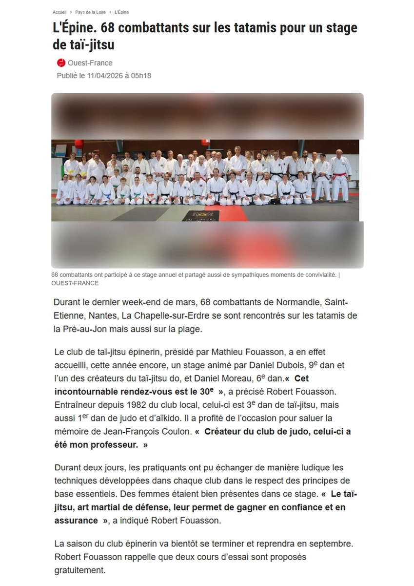 Le club d'Avrillé a participé au Stage Régional de Tai Jitsu Do du 28 et 29 mars 2026 à Noirmoutier.